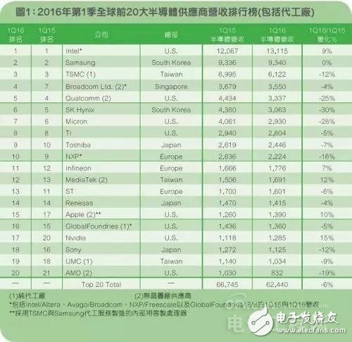 2016年第1季全球前20大半導(dǎo)體供應(yīng)商銷售排行榜 (來源:IC Insights)