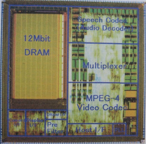 以下照片中的LSI中安裝了個人電視電話及多媒體瀏覽器所必需的多個信號處理部分及12M位DRAM的同時,內(nèi)置用于連接CMOS型固體攝像器件及液晶面板的圖像輸入輸出接口電路。