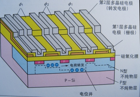 CCD具有形成于基板表面的N型不純物層的上面像鏈條一樣并排多個(gè)MOS型電極的結(jié)構(gòu)。轉(zhuǎn)發(fā)電極是重合2層或3層多晶硅的結(jié)構(gòu),盡可能縮小電極和電極的間隔形成。沿著排放的轉(zhuǎn)發(fā)電極,施加以時(shí)鐘脈沖的話,存在于電極之下的電荷將按順序向旁邊的電極之下移動。