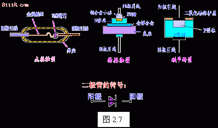 圖2.7中的硅工藝平面型二極管結(jié)構(gòu)圖, 是集成電路中常見的一種形式。代表二極管的符號也在圖2.7中示出。