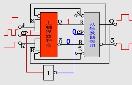 ??? S當(dāng)CP=1時(shí),輸入J、K影響主觸發(fā)器,而從觸發(fā)器狀態(tài)不變。當(dāng)CP從1變成0時(shí),主觸發(fā)器的狀態(tài)傳送到從觸發(fā)器,即主從觸發(fā)器是在CP下降沿到來(lái)時(shí)才使觸發(fā)器翻轉(zhuǎn)的。