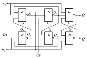 電路結構: 該觸發(fā)器由6個與非門組成,其中G1和G2構成基本RS觸發(fā)器。