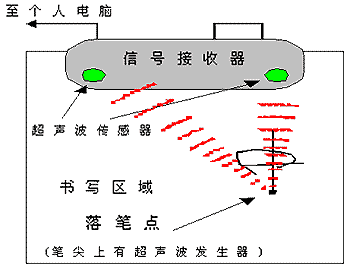 ????超聲波技術(shù)的原理是:利用超聲波的傳輸速度較慢的特性,根據(jù)超聲波發(fā)射到接收時間計算出發(fā)射點到接收點的距離。使用在平面定位上的原理采用的是在屏幕的一邊放置兩個按固定距離分布的超聲接收裝置,用于定位的筆是一個超聲波發(fā)射器,當筆移動在屏幕的表面時,所發(fā)射的超聲波沿屏幕表面被接收器檢測到,由收到超聲波的時間可以換算出筆與兩個接收器的距離。采用三點定位的原理,即根據(jù)三角形已知三個邊長可以確定筆所在的頂點原理,計算出筆所在的位置坐標。是一種測距定位模式。