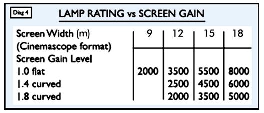 觀眾所見的銀幕亮度取決于數(shù)個(gè)因素:放映燈發(fā)出的光,放映燈光從反光鏡穿過鏡頭和放映窗玻璃到銀幕間的光損失和從銀幕來的反射光?,F(xiàn)代電影院放映機(jī)使用氙燈(相對于舊式碳精燈技術(shù))有各種不同功率, 根據(jù)銀幕尺寸的大小不同,大多數(shù)多廳影院的氙燈功率為2.0千瓦到7.0千瓦,燈功率越大光輸出就越大,但氙燈的成本也越高耗電量也越大。