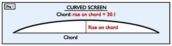 ?白塑幕通常安裝在平直銀幕架上.然而為了使光的反射和影廳各部分的觀看角度達(dá)到最佳,增益幕最好安裝在弧形銀幕架上。由于白塑幕使光散射,若使用弧形幕架會產(chǎn)生對比度的損失因此不推薦使用。增益銀幕的弧形的弧度取決于諸多因素,但通常采用20:1的絃高比(見圖1)。