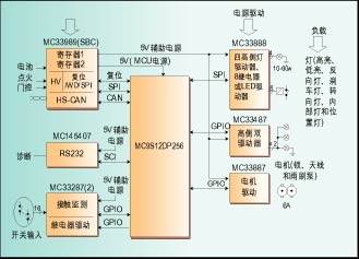 ??? 本文介紹摩托羅拉公司的MC9S12DP25616位MCU和若干個外圍IC產(chǎn)品,這些產(chǎn)品專為適應(yīng)汽車系統(tǒng)中常見的惡劣環(huán)境而設(shè)計,此外,還詳細討論這些產(chǎn)品提供的高級診斷功能。圖1給出了所用方案的方框圖。