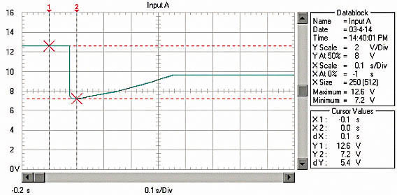 由于RM、RB、RL均非常低,啟動電流非 常大。例如用12V、45Ah的蓄電池啟動安裝1.9升柴油機的汽車,蓄電池的電壓在啟動瞬間由12.6V降到約3.6V!啟動過程的蓄電池電壓波形如圖 1;啟動瞬時的電流達550A,約為蓄電池的12C的放電率!啟動過程的蓄電池電流波形如圖2,(電流傳感器的電流/電壓變換比率:100A/V)。盡管 車用蓄電池是啟動專用蓄電池,可以高倍率放電,但在圖1中可以看出,10倍以上的高倍率放電時的蓄電池性能變得很差,而且,如此高倍率放電對蓄電池的損傷 也是非常明顯的。啟動過程的電壓劇烈變化也是極強的電磁干擾,可以造成電氣設備的“掉電”,迫使電氣設備在發(fā)電機啟動過程結束后 重新上電,計算機在這個過程中非常容易死機。因此,無論從改善汽車電氣設備的電磁環(huán)境還是改善汽車的啟動性能和蓄電池的性能、延長使用壽命來考慮,改善汽 車電源在啟動過程的性能是必要的。