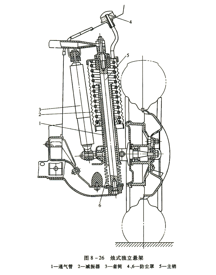 燭式懸架的結(jié)構(gòu)特點是車輪沿著剛性地固定在車架上的主銷軸線上下移動。燭式懸架的優(yōu)點是:當(dāng)懸架變形時,主銷的定位角不會發(fā)生變化,僅是輪距、軸距稍有變化,因此特別有利于汽車的轉(zhuǎn)向操縱穩(wěn)定和行駛穩(wěn)定。但燭式懸架有一個大缺點:就是汽車行駛時的側(cè)向力會全部由套在主銷套筒的主銷承受,致使套筒與主銷間的摩擦阻力加大,磨損也較嚴(yán)重。燭式懸架現(xiàn)已應(yīng)用不多。