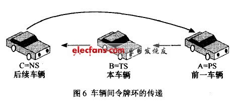 除了基于CSMA/CA和時隙類的MAC協(xié)議外,還有一些其他類型的MAC協(xié)議,如令牌環(huán)。在具備GPS系統(tǒng)的車輛問可以使用基于非競爭性的令牌環(huán)接入方式(如WTRP協(xié)議),以提高信道利用率,避免信道沖突,更能滿足車輛間安全預(yù)警通信的時延要求。在車載自組網(wǎng)中應(yīng)用令牌環(huán)的主要思想:在廣播信道上通過令牌組成邏輯環(huán)來控制信道的接入,為表述方便,稱本車輛(對應(yīng)通信網(wǎng)絡(luò)中的本地節(jié)點)為TS(this station);前一車輛(對應(yīng)通信網(wǎng)絡(luò)中的上一節(jié)點)為PS(previous station);后續(xù)車輛(對應(yīng)通信網(wǎng)絡(luò)中的后續(xù)節(jié)點)稱為NS(next smtion)??紤]實際車輛隊列中,設(shè)車輛A,B,C構(gòu)成隊列,隊列內(nèi)采用無線令牌環(huán)協(xié)議,三輛車組成邏輯令牌環(huán),令牌傳遞順序為A—B—C—A。設(shè)某一時刻B為令牌擁有者,令B為TS,相應(yīng)的A為PS,C為NS。網(wǎng)絡(luò)結(jié)構(gòu)示意如圖6所示,圖中箭頭方向表示令牌傳遞方向,當(dāng)車輛持有令牌后才能開始進(jìn)行數(shù)據(jù)的發(fā)送,而那些沒有持有令牌的車輛只能進(jìn)行數(shù)據(jù)的接受。當(dāng)傳送完一定的數(shù)據(jù)后,令牌擁有者把令牌傳遞給后續(xù)車輛,開始下一輛車的數(shù)據(jù)傳送。