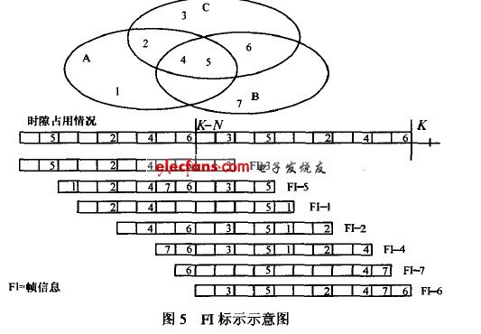 ?、?通過每幀周期廣播幀信息(FI,frame information),使所有的鄰節(jié)點都知道每一個時隙的信道使用狀況,從而使RR—AL OHA協(xié)議能夠在車載自組網(wǎng)中正確運行。FI是發(fā)送節(jié)點感知的前一幀的時隙狀態(tài)信息。RR—AL OHA 可以在不同的物理層標(biāo)準(zhǔn)下使用,尤其適合采用時隙結(jié)構(gòu)的物理層。當(dāng)有節(jié)點加入時,先偵聽一幀的時間,然后選擇一個空閑時隙發(fā)送一個分組,來預(yù)約這個時隙。如果鄰節(jié)點正確接收到了該分組,則在它的FI中標(biāo)示出來。當(dāng)新加入的節(jié)點從一幀時間內(nèi)收到的所有FI中知道鄰節(jié)點都正確接受到分組時,即認(rèn)為預(yù)約成功,從而將每幀的該時隙作為它的基本信道(BC,base channe1),直到節(jié)點離開網(wǎng)絡(luò),在這期間其他節(jié)點不能訪問該時隙。其中,BC 信道用于傳送FI、其他信令信息和承載有效載荷。在每一幀中,節(jié)點都必須在自己的BC中發(fā)送FI信息,并根據(jù)鄰節(jié)點的FI和自己的信道使用情況及時更新FI信息。當(dāng)BC信道提供的帶寬不能滿足業(yè)務(wù)的要求時,節(jié)點可以通過預(yù)約附加信道的方式占用其他空閑信道,以滿足業(yè)務(wù)要求。如果是點對點通信,節(jié)點還可以預(yù)約點對點(P2P,point—to—point)信道進(jìn)行傳送,以實現(xiàn)相鄰一跳群中的時隙復(fù)用,提高信道的利用率。圖5顯示了節(jié)點交換FI信息的示例。