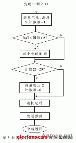 輪胎監(jiān)測(cè)模塊的主程序在執(zhí)行完初始化功能后便根據(jù)當(dāng)前氣壓值與報(bào)警閾值的差值設(shè)置定時(shí)中斷時(shí)間,然后進(jìn)入低功耗模式。模塊供電電壓、輪胎氣壓和溫度的監(jiān)測(cè)與數(shù)據(jù)的傳輸都放置在中斷程序,中斷結(jié)束立即進(jìn)入低功耗模式。NPX-C10746內(nèi)置中斷定時(shí)時(shí)間大約為0.5秒~4秒,輪胎氣壓和溫度正常時(shí),可取3秒定時(shí)中斷一次,調(diào)用NPX的輪胎氣壓和溫度檢測(cè)與補(bǔ)償、CRC-16校驗(yàn)計(jì)算執(zhí)行庫(kù)后,通過(guò)無(wú)線方式發(fā)送給主機(jī)顯示模塊。在氣壓及溫度接近或低于報(bào)警閾值時(shí),縮短定時(shí)中斷時(shí)間,增加數(shù)據(jù)采樣及發(fā)送頻率。因?yàn)楸O(jiān)測(cè)模塊供電電壓下降相對(duì)比較緩慢,這里采用軟件計(jì)數(shù)定時(shí)中斷來(lái)延長(zhǎng)其檢測(cè)周期,取20次中斷(60秒)采樣一次。定時(shí)中斷程序流程如圖3所示。