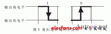 系統(tǒng)的無(wú)線通信載波頻率選用433.92MHz,發(fā)射速率取9600bps,采用FSK調(diào)制方式。發(fā)射前先對(duì)數(shù)據(jù)幀進(jìn)行曼徹斯特編碼。曼徹斯特編碼(如圖5所示)就是用兩個(gè)bit之間的電平變化來(lái)表示數(shù)字信號(hào)0或1。由高電平變?yōu)榈碗娖奖硎緮?shù)字0,反之則表示數(shù)字1。通過(guò)曼徹斯特編碼可以減小發(fā)射信號(hào)的直流分量,降低誤碼率,提高通信距離。
