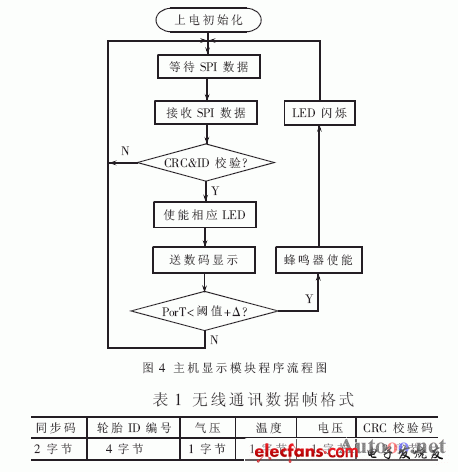 主機(jī)上電后,P89LPC930初始化,配置完MC33594后,模塊進(jìn)入等待SPI數(shù)據(jù)工作狀態(tài)。在接收到一個(gè)數(shù)據(jù)幀并經(jīng)CRC校驗(yàn)(采用查表法實(shí)現(xiàn),減小MCU占用時(shí)間)和輪胎ID判斷無(wú)誤后,送數(shù)碼顯示并點(diǎn)亮相應(yīng)的指示燈以表示各模塊工作正常。當(dāng)輪胎監(jiān)測(cè)模塊供電電壓、氣壓及溫度接近或低于報(bào)警閾值時(shí),主機(jī)啟動(dòng)LED閃爍警告或蜂鳴器報(bào)警。程序流程圖如圖4所示。