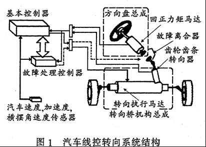 方向盤模塊包括方向盤、方向盤轉(zhuǎn)角、力矩傳感器、方向盤回正力矩電機(jī)。方向盤模塊的主要功能是將駕駛員的轉(zhuǎn)向意圖(通過測量方向盤轉(zhuǎn)角)轉(zhuǎn)換成數(shù)字信號并傳遞給主控制器;同時接受ECU送來的力矩信號,產(chǎn)生方向盤回正力矩以提供給駕駛員相應(yīng)的路感信號。轉(zhuǎn)向執(zhí)行模塊包括前輪轉(zhuǎn)角傳感器、轉(zhuǎn)向執(zhí)行電機(jī)、轉(zhuǎn)向電機(jī)控制器和前輪轉(zhuǎn)向組件等。轉(zhuǎn)向執(zhí)行模塊的功能是接受ECU的命令,控制轉(zhuǎn)向電機(jī)實現(xiàn)要求的前輪轉(zhuǎn)角,完成駕駛員的轉(zhuǎn)向意圖。ECU對采集的信號進(jìn)行分析處理,判別汽車的運動狀態(tài),向方向盤回正力電機(jī)和轉(zhuǎn)向電機(jī)發(fā)送命令,控制兩個電機(jī)的工作。自動防故障系統(tǒng)是線控轉(zhuǎn)向系的重要模塊,它包括一系列監(jiān)控和實施算法,針對不同的故障形式和等級作出相應(yīng)處理,以求最大限度地保持汽車的正常行駛。汽車的安全性是必須首先考慮的因素,是一切研究的基礎(chǔ),因而故障的自動檢測和自動處理是線控轉(zhuǎn)向系統(tǒng)最重要的組成系統(tǒng)之一。