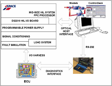 在上述環(huán)節(jié)中硬件在回路(HIL)測試承擔了重要的任務,其實質是一套與電子控制器真實連接的測試系統(tǒng),用于檢測汽車電子控制器大部分功能性故障。