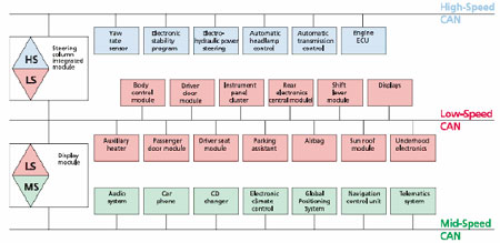 雜與強大。各個ECU必須基于總線技術(如CAN總線)進行信息傳遞,資源共享。如圖2-3,整個汽車網絡可以分為速率不同的網絡。同一速率的網絡中每個ECU有控制信號通訊,不同速率的網絡中的ECU也有通訊,整個網絡中所有ECU形成一個整體,互相影響,一個ECU的功能出錯會影響其他ECU的工作,甚至會引起整個網絡的崩潰。