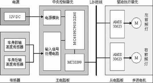 如圖1所示,系統(tǒng)可分為三個(gè)部分,即車身高度傳感器、中央控制單元和驅(qū)動執(zhí)行單元。系統(tǒng)運(yùn)作情況如下:該系統(tǒng)的主MCU(MC68HC908GZ60)采集車身前后軸高度傳感器的信號,經(jīng)運(yùn)算后發(fā)出控制信號分別給左右前照燈的水平調(diào)光步進(jìn)電機(jī),指示電機(jī)轉(zhuǎn)動到指定位置,完成自動調(diào)光。
