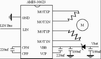此處選擇了美國AMI半導(dǎo)體公司的AMIS-30623步進(jìn)電機(jī)控制芯片。該芯片屬高集成度芯片,內(nèi)建了電源模塊、控制器、LIN總線收發(fā)器和步進(jìn)電機(jī)驅(qū)動。其主要特性有:最高峰值電流輸出達(dá)800mA;提供最高達(dá)16細(xì)分?jǐn)?shù)的步進(jìn)電機(jī)驅(qū)動;內(nèi)建加減速算法;完全兼容LIN1.3規(guī)范。