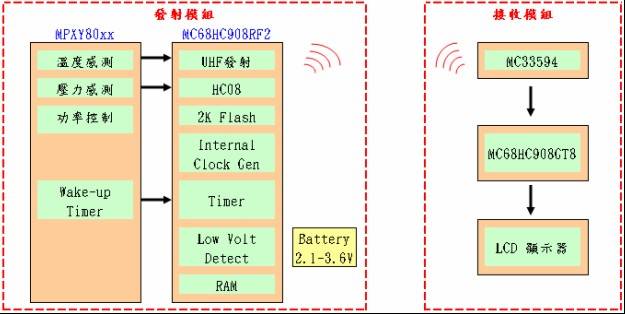 ??? 發(fā)射模塊由胎壓傳感器MPXY80xx及內含射頻發(fā)射的微控制器MC68HC908RF2組成,MPXY80xx工作在2.1-3.6V,具有低功耗的效能以延長電池壽命。并整合MCUwake-uptimer與自身的低頻震蕩器。此外,其輸出為8bit數(shù)字輸出,并已經與MC68HC908RF2完成接口最佳化。接收模塊主要由射頻接收芯片MC33594及微控制器MC68HC908GT8及相關的外圍線路組成。接收靈敏度為90dBm,因為訊號發(fā)射時間很短,加上每個發(fā)射單元都有其獨特ID,就由此可減少汽車EMI的干擾影響。
