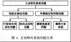 ??? 主動轉(zhuǎn)向系統(tǒng)所能實現(xiàn)的功能分類如圖4所示,主要包括駕駛員輔助功能以及穩(wěn)定車輛功能。下面對這兩大功能的實現(xiàn)原理作進一步的闡述。
