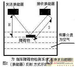 倒車撿測障礙糸統(tǒng)超聲換能器的工作方式為反射式,,即發(fā)送傳感器換能器發(fā)射40KHz頻率的超聲波,迂到障礙后反射被接收傳感器的換能器接收并轉(zhuǎn)換成電信號,見圖2所示.