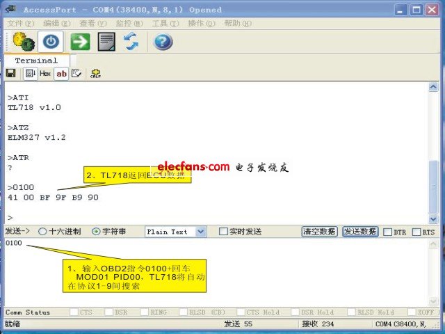 TL718 Starting注:ATZ指令返回 ELM327 V1.2是為了使用現(xiàn)成的國(guó)外OBD觀軟件,所以用了這個(gè)返回信息。