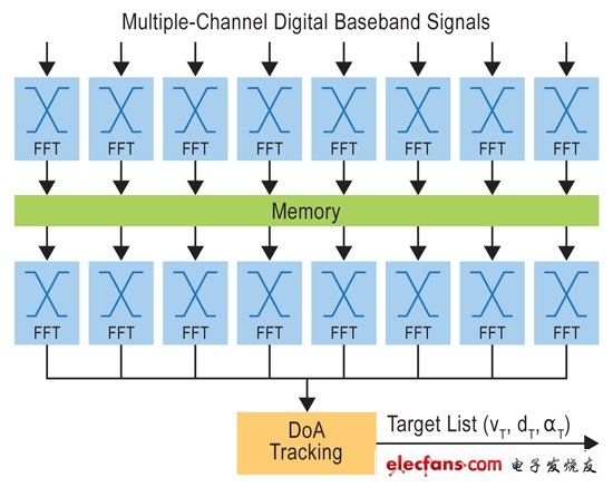 來自每一通道的數(shù)字基帶信號流入到快速傅里葉變換(FFT)模塊中,實現(xiàn)長度高達2K采樣的變換。Reuter說:“過去,執(zhí)行FFT意味著需要很多FPGA。今天,發(fā)展趨勢是集成了浮點DSP加速器的32位微控制器。”聚束系統(tǒng)可以使用兩塊FFT從信號中提取出范圍和速度數(shù)據(jù),如圖3所示。