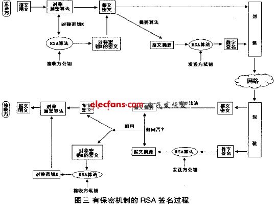 在上述簽名方案中,報(bào)文是以明文方式發(fā)生的。所以不具備保密功能。如果報(bào)文包含不能泄漏的信息,就需要先進(jìn)行加密,然后再進(jìn)行傳送。具有保密機(jī)制的RSA簽名的整個(gè)過程如下圖所示: