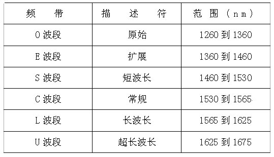 如下表所示,激光器在接近紅外范圍的“窗口”中產(chǎn)生光。窗口是為光學(xué)傳輸而優(yōu)化的紅外范圍。為了闡明光纖系統(tǒng)所用的術(shù)語(yǔ),ITU最近定義了下列光譜帶。這些定義的目的僅僅是為了分類(lèi)。