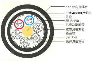 此結(jié)構(gòu)光纜是由6根松套管(或部分填充繩)繞中心非金屬加強(qiáng)構(gòu)件(FRP)絞合成圓整的纜芯,纜芯外擠上PE內(nèi)護(hù)套后再饒絞一定數(shù)量起增強(qiáng)作用的芳綸(Kevlar),最后擠上PE外護(hù)層.松套管是由溫度特性好的材料擠成,管中放入具有合適余長(zhǎng)的多根(2-8芯)單?;蚨嗄9饫w,并充滿防潮光纖用油膏,纜芯所有縫隙均填充有阻水化合物。