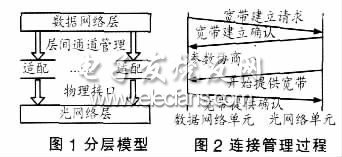 IPoverWDM的分層模型主要有光網(wǎng)絡(luò)層、數(shù)據(jù)網(wǎng)絡(luò)層及適配和管理功能組成,如圖1所示。光網(wǎng)絡(luò)層負(fù)責(zé)提供通道;數(shù)據(jù)網(wǎng)絡(luò)層提供數(shù)據(jù)的處理和傳送;層間適配和管理用于適配數(shù)據(jù)網(wǎng)絡(luò)和光網(wǎng)絡(luò),包括保護(hù)和恢復(fù)、配置管理、性能管理、連接管理和會(huì)話(huà)管理等。在連接過(guò)程中,數(shù)據(jù)網(wǎng)絡(luò)單元和光網(wǎng)絡(luò)單元通過(guò)相應(yīng)的協(xié)議進(jìn)行協(xié)商,以提供連接所需要的帶寬。連接管理過(guò)程如圖2。