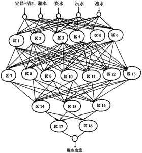 根據(jù)神經(jīng)網(wǎng)絡(luò)結(jié)構(gòu)要求,上下各個(gè)節(jié)點(diǎn)之間相互有聯(lián)系。但從物理意義上來(lái)看,河網(wǎng)上下區(qū)域并不是都有必然聯(lián)系。因此,本文將上下區(qū)域沒(méi)有必然聯(lián)系的點(diǎn)之間的權(quán)重強(qiáng)加為0,這樣使模型既滿(mǎn)足神經(jīng)網(wǎng)絡(luò)結(jié)構(gòu)的要求,又符合河網(wǎng)水流運(yùn)動(dòng)規(guī)律。如區(qū)3除與區(qū)11有水量交換外,與第三層其余節(jié)點(diǎn)之間沒(méi)有水量交換,故在模型中可以賦0.另外為簡(jiǎn)化起見(jiàn),三口來(lái)流合并為一個(gè)來(lái)流,故荊江與洞庭湖之間的關(guān)系可以概化為與圖2相似的網(wǎng)絡(luò)模型。