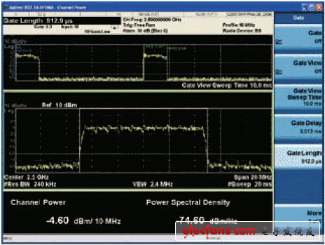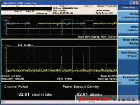 圖4 圖中的信道功率測量使用WiMAX下行鏈路猝發(fā)脈沖進(jìn)行選通。該猝發(fā)脈沖由1個(gè)前導(dǎo)碼和8個(gè)符碼組成
