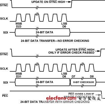 ADI 公司的眾多DAC 都采用了分組差錯(cuò)校驗(yàn)(PEC)的形式 來實(shí)現(xiàn)CRC。不需要PEC 功能時(shí),則寫入24 位數(shù)據(jù)。要添加 PEC 功能,24 位數(shù)據(jù)需增加相應(yīng)的8 位校驗(yàn)和。如果接收的 校驗(yàn)和與數(shù)據(jù)不一致,輸出引腳被拉低,指示存在錯(cuò)誤??刂?器清除錯(cuò)誤,使引腳返回高電平,并重新發(fā)送數(shù)據(jù)。圖1 所示 為如何用SPI?接口應(yīng)用數(shù)據(jù)的示例。表1 列出了能夠采用分組 差錯(cuò)校驗(yàn)的ADI 器件示例。