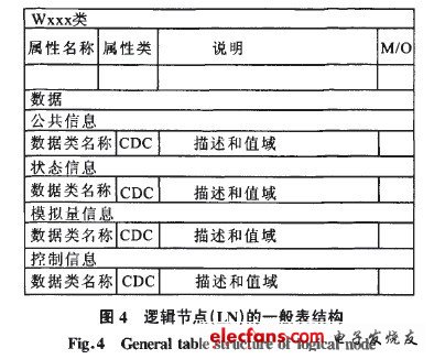 其中,最上層成為邏輯設(shè)備(LD),向下依次被分解為邏輯節(jié)點(LN).邏輯節(jié)點由一組相關(guān)的數(shù)據(jù)即數(shù)據(jù)類(DC)組成.所有邏輯節(jié)點都有一個標準化的表結(jié)構(gòu),如圖4所示.有些基本的數(shù)據(jù)類被定義為公用數(shù)據(jù)類(CDC),其他的數(shù)據(jù)類都繼承某個公用數(shù)據(jù)類的一組屬性.公用數(shù)據(jù)類由數(shù)據(jù)屬性組成,數(shù)據(jù)的最基本、最詳細的部分可以在公用數(shù)據(jù)類的類型定義中找到.