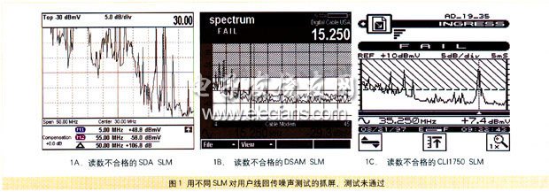 圖1所示為用戶線回傳噪聲讀數(shù)不符合要求(高于-30dBmV)的SDA數(shù)字分析儀、DSAM和CLI 1750 SLM的截屏。如果回傳通道測定值高于-30dBmV,那么,在將用戶線連接至分支器之前,必須診斷、查明并解決問題。