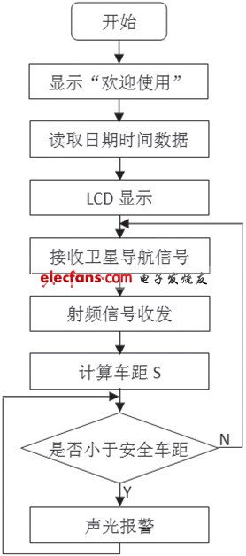 系統(tǒng)工作時(shí),首先進(jìn)行系統(tǒng)自檢和初始化設(shè)置,并通過LCD模塊顯示“歡迎使用”界面。然后通過衛(wèi)星導(dǎo)航模塊接收經(jīng)緯度信息并輸入到單片機(jī),單片機(jī)通過控制射頻收發(fā)模塊,采用nRF2401模塊的通道1發(fā)送經(jīng)緯度信息,同時(shí)采用通道2接收周圍的經(jīng)緯度信息,并將接收到的周圍車輛的經(jīng)緯度信息輸入到單片機(jī)進(jìn)行處理。