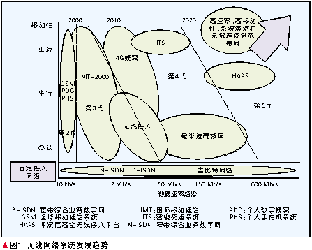 ??? 當(dāng)今世界,基于波分復(fù)用(WDM)技術(shù)的光纖通信網(wǎng)絡(luò)已經(jīng)成為高速、大容量信息網(wǎng)絡(luò)發(fā)展的理想有線平臺(tái)。國(guó)際上的跨國(guó)公司競(jìng)相開(kāi)展了基于WDM技術(shù)的太比特級(jí)信息傳輸試驗(yàn),目前已經(jīng)實(shí)現(xiàn)10.9 Tb/s的傳輸。網(wǎng)絡(luò)光纖化的重點(diǎn)從長(zhǎng)途骨干網(wǎng),然后轉(zhuǎn)向中繼網(wǎng)和接入網(wǎng)的饋線段,目前正在逐漸向配線段延伸。中國(guó)長(zhǎng)途網(wǎng)的光纖化比例目前已高達(dá)82%。然而,隨著光纖逐漸向用戶推進(jìn),光纖化的代價(jià)變得越來(lái)越高。除非技術(shù)上有重大突破,光纖到家、到用戶將是一項(xiàng)十分艱巨的任務(wù)。就中國(guó)來(lái)說(shuō),光纖到樓、光纖到小區(qū)和光纖到路邊是中近期的比較現(xiàn)實(shí)的目標(biāo)。另一方面,由于方便、個(gè)人化和無(wú)處不在的特性,無(wú)線接入成為信息時(shí)代的寵兒,發(fā)展十分迅猛,成為全球通信網(wǎng)絡(luò)發(fā)展的另一個(gè)重要方向,是目前全球范圍內(nèi)最吸引人的一個(gè)熱點(diǎn)問(wèn)題。移動(dòng)通信由目前的數(shù)字話音服務(wù)的2.5G向?qū)崿F(xiàn)視頻、多媒體服務(wù)的3G、B3G甚至4G、5G的高速、寬帶業(yè)務(wù)發(fā)展。而各種新業(yè)務(wù)和寬帶無(wú)線接入技術(shù)的不斷涌現(xiàn),如流媒體業(yè)務(wù)、射頻標(biāo)識(shí)(RFID)、傳感器聯(lián)網(wǎng)、WiMAX、本地多點(diǎn)分配業(yè)務(wù)(LMDS)等,要求網(wǎng)絡(luò)能夠安全、靈活、無(wú)所不在地、大容量地提供綜合服務(wù)。如圖1所示,未來(lái)無(wú)線通信的發(fā)展趨勢(shì)是高速率、高移動(dòng)性以及不同無(wú)線網(wǎng)絡(luò)之間多業(yè)務(wù)的無(wú)縫連接。但是,無(wú)線網(wǎng)絡(luò)的快速發(fā)展面臨著諸多問(wèn)題,典型地有:現(xiàn)有無(wú)線接入網(wǎng)的兼容性問(wèn)題、數(shù)據(jù)的速率(特別是移動(dòng)情況下)仍然是無(wú)線通信的“瓶頸”問(wèn)題以及現(xiàn)有網(wǎng)絡(luò)如何平滑地過(guò)渡到下一代無(wú)線網(wǎng)絡(luò)等。