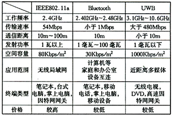 UWB信號(hào),在發(fā)射時(shí)將微弱的無線電脈沖信號(hào)分散在寬闊的頻帶中,輸出功率甚至低于普通設(shè)備產(chǎn)生的噪聲。接收時(shí)將信號(hào)能量還原出來,在解擴(kuò)過程中產(chǎn)生擴(kuò)頻增益。因此,與IEEE 802.11a、IEEE 802.11b和藍(lán)牙相比,在同等碼速條件下,UWB具有更強(qiáng)的抗干擾性。表1給出了目前幾種主要的無線通信技術(shù)的主要性能指標(biāo)參數(shù)。