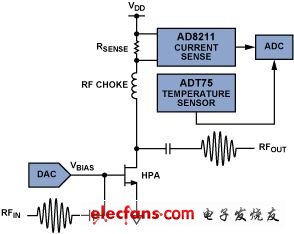 一種較佳的方法是動態(tài)控制功放的柵極電壓,其原理是,使用數(shù)字控制算法測量漏極電流,通過ADC將該漏極電流轉(zhuǎn)換為數(shù)字量,并且使用一個(gè)高分辨率DAC或一個(gè)較低分辨率的數(shù)字電位計(jì)設(shè)定所需的偏置。通過這個(gè)用戶可調(diào)的控制系統(tǒng)可以使功放維持在所需的偏置狀態(tài),以實(shí)現(xiàn)最優(yōu)的性能,而無論電壓、溫度和其他環(huán)境參數(shù)如何變化。