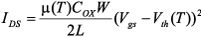 LDMOS晶體管的源漏電流IDS是柵源電壓Vgs的函數(shù),包含與溫度相關(guān)的兩項(xiàng),即有效電子遷移率μ和閾值電壓Vth