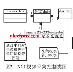 視頻采集控制模塊主要負(fù)責(zé)視頻的采集、壓縮和控制命令的響應(yīng),采集視頻時(shí)主要負(fù)責(zé)采集卡的啟動(dòng)、初始化和各種控制操作,同時(shí)也負(fù)責(zé)攝像頭相關(guān)的一些控制操作。具體的軟件構(gòu)架如圖2所示。其中:NCCMain模塊負(fù)責(zé)管理各個(gè)子模塊,打開Socket監(jiān)聽7020端口,當(dāng)有從網(wǎng)絡(luò)代理模塊的連接請(qǐng)求時(shí),則響應(yīng)并接收數(shù)據(jù);數(shù)據(jù)處理模塊負(fù)責(zé)處理各種命令(如視頻的開啟和焦距調(diào)整命令),并對(duì)這些命令發(fā)送確認(rèn)消息進(jìn)行響應(yīng);RS2232串口線控制模塊通過RS2232串口線控制攝像機(jī)的拍攝焦距,以響應(yīng)焦距調(diào)整命令;板卡采集管理模塊主要負(fù)責(zé)板卡的初始化、采集信道的開啟、H.264各種參數(shù)(I、P幀的間距、量化參數(shù)、編碼格式(CIF、QCIF)等)的設(shè)置、回調(diào)函數(shù)的設(shè)置,與代理進(jìn)行連接從而向代理發(fā)送視頻流等操作。該模塊基于采集卡開發(fā)包,通過接口調(diào)用廠商提供的驅(qū)動(dòng)程序來實(shí)現(xiàn)各種功能。