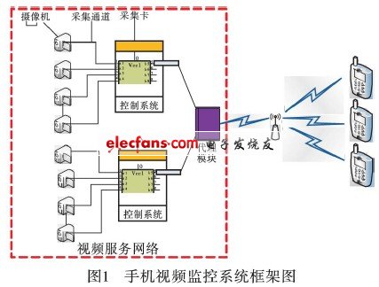 視頻監(jiān)控系統(tǒng)由視頻拍攝節(jié)點(diǎn)、視頻采集控制模塊、網(wǎng)絡(luò)代理模塊和觀看終端組成。其中,拍攝節(jié)點(diǎn)為高精度攝像機(jī),負(fù)責(zé)采集原始視頻;視頻采集控制模塊由采集卡以及控制軟件組成,采集卡安裝在嵌入式主板上,把攝像機(jī)采集的原始視頻數(shù)據(jù)壓縮成H.264格式的碼流并回調(diào)給系統(tǒng)處理;控制軟件運(yùn)行在嵌入式Linux系統(tǒng)上,通過采集卡的驅(qū)動(dòng)程序獲取壓縮后的H.264格式的碼流,并控制與網(wǎng)絡(luò)代理模塊的連接以及數(shù)據(jù)和命令的傳輸及響應(yīng),如將壓縮后的碼流傳輸給網(wǎng)絡(luò)代理,對(duì)某個(gè)攝像機(jī)通過串口發(fā)控制命令;網(wǎng)絡(luò)代理模塊負(fù)責(zé)與視頻觀看終端進(jìn)行網(wǎng)絡(luò)連接的管理以及控制命令和視頻數(shù)據(jù)的傳輸;觀看終端為主流的基于Symbian操作系統(tǒng)的智能手機(jī)。
