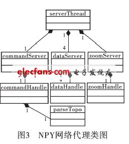 c)視頻數(shù)據(jù)收發(fā)模塊。當(dāng)接收到來自視頻采集控制模塊的H.264視頻碼流便將此視頻數(shù)據(jù)流轉(zhuǎn)發(fā)給發(fā)出點(diǎn)播命令的手持設(shè)備。網(wǎng)絡(luò)代理模塊的結(jié)構(gòu)關(guān)系如圖3所示。