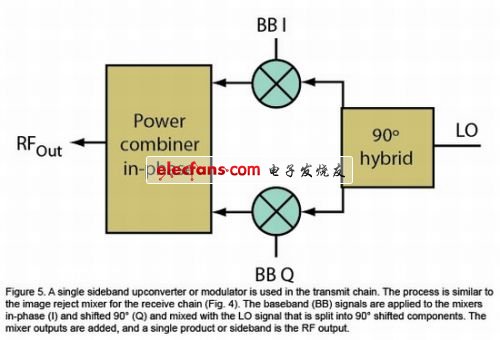 圖5:單邊帶上變頻器或調(diào)制器用于發(fā)射信號(hào)鏈中。此過程類似于接收信號(hào)鏈的鏡像抑制混頻器(圖4)?;鶐?BB)信號(hào)被施加到同相(I)和90°相移(Q)混頻器,并與分成90°相移分量的LO信號(hào)進(jìn)行混頻。增加了混頻器輸出,單個(gè)產(chǎn)物或邊帶為RF輸出。