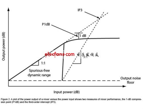 在標(biāo)準(zhǔn)或線性工作條件下,混頻器的變頻損耗是恒定的,與RF功率無關(guān)。這意味著,當(dāng)你以1dB的幅度增加輸入功率時(shí),輸出功率也會(huì)以1dB遞增。在P1dB壓縮點(diǎn),輸入功率增加,以便輸出不隨輸入功率線性增加。這也是混頻器變頻損耗高出理想值1dB的原因(圖2)。
