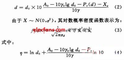 式中:Pr(d)為接收信號強度表達式(距離發(fā)射點d m處);A0表示節(jié)點的發(fā)射功率;d0表示接收功率的參考點;γ0為自由空間路徑損耗指數(shù)(γ0=2);γ表示實際的路徑損耗指數(shù);Xσ表示0均值的高斯分布隨機變量;標準偏差為σ。在實際的無線傳感器網(wǎng)絡中,節(jié)點可以測量并記錄來自其他節(jié)點的型號強度,由式(1)推出: