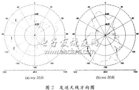 由于發(fā)送端設(shè)備位于導(dǎo)彈上,接收端設(shè)備位于飛機(jī)上,故而存在收發(fā)天線失配問題,設(shè)計(jì)時(shí)接收端天線采用圓極化形式,發(fā)送端天線采用一對垂直分布的線極化天線,這樣將極化損耗降到最低,有利于接收端的接收。同時(shí)考慮通信時(shí)抗干擾問題,發(fā)送端天線采用后向天線圖形式,為增加抗干擾性,還要求發(fā)送端天線具有一定的增益。圖2為發(fā)送天線仿真圖。