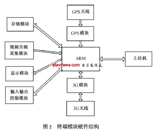 系統(tǒng)終端硬件采用嵌入式開發(fā)平臺,主要模塊有處理器,3G通信模塊,GPS信號接受模塊,手柄控制模塊,液晶顯示模塊,攝像頭,電源模塊,存儲模塊等組成。在處理器的選擇上,采用ARM芯片,它強大的運算速度和數(shù)據(jù)處理能力以及便于進行嵌入式系統(tǒng)開發(fā),能夠?qū)σ曨l等信息進行處理。