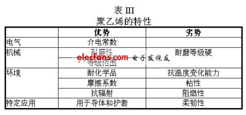 聚乙烯(表III)最適用于導體絕緣,由于聚乙烯護套比較硬,對電纜的柔韌性有影響。聚乙烯和泡沫材料一起使用時,具有很好的介電屬性。從機械力學角度來說,高分子重量的聚乙烯具有耐磨損和低摩擦的特點,但相對于其他材料來說,它還是顯得比較硬。與聚氨酯一樣,聚乙烯的應用溫度范圍也很小,很難將防化材料和聚乙烯材質(zhì)的電纜護套相結合。聚乙烯的機械屬性在阻燃處理后會降低。